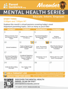 • Ask a Therapist live virtual event. This is an anonymous opportunity to ask questions from a licensed family therapist about your child’s mental health. It is a live event on November 11th at 6 pm with access to the recording afterward. Registration Link